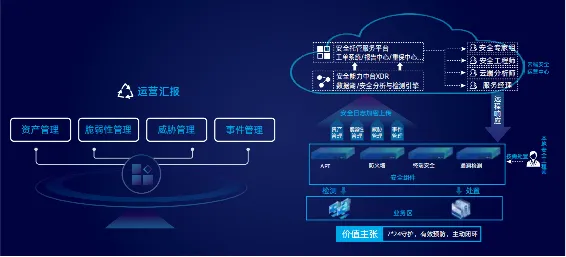 以保障风险管控效果为目标,以“人机共智”模式为手段,以7×24h持续在线守护为主线,围绕资产、脆弱性、威胁、事件四个核心风险要素,提升组织安全风险管控能力。
